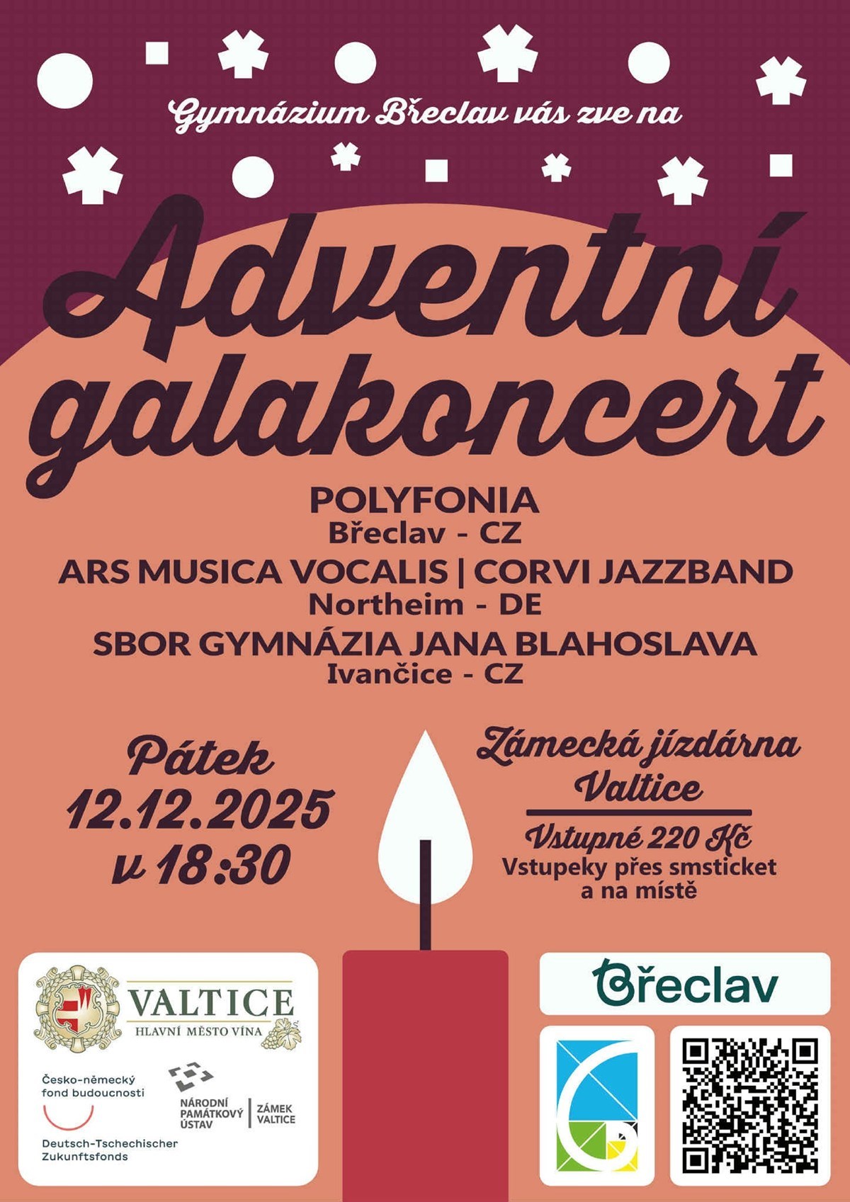 Tradiční adventní galakoncert pěveckého sboru Polyfonia z břeclavského gymnázia ve valtické jízdárně. Po dvou letech se vrací do Valtic sbor a jazzband z partnerského gymnázia Corvinianum v Northeimu. Společně zazpívají část Mírové mše Karla Jenkinse a jazzové vánoční písně.